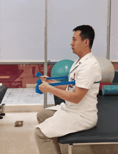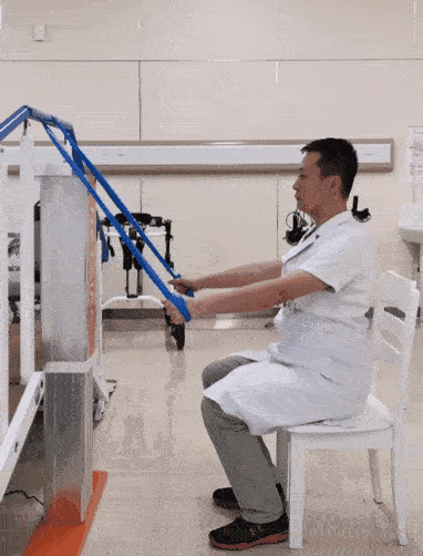 將彈力帶繞過(guò)身體前方的橫桿等固定物體,兩端纏繞于雙手上。坐位,身體保持正直,兩手緩慢向下拉動(dòng)彈力帶,直至彈力帶呈緊繃狀態(tài)。然后,緩慢還原至初始姿勢(shì)。此為一個(gè)完整動(dòng)作。8~12次/組,做3組。