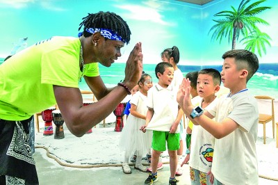 在位于湖南高橋大市場的中非經(jīng)貿(mào)博覽會常設(shè)展館安哥拉館,志愿者和學(xué)生在研學(xué)過程中擊掌。新華社發(fā)