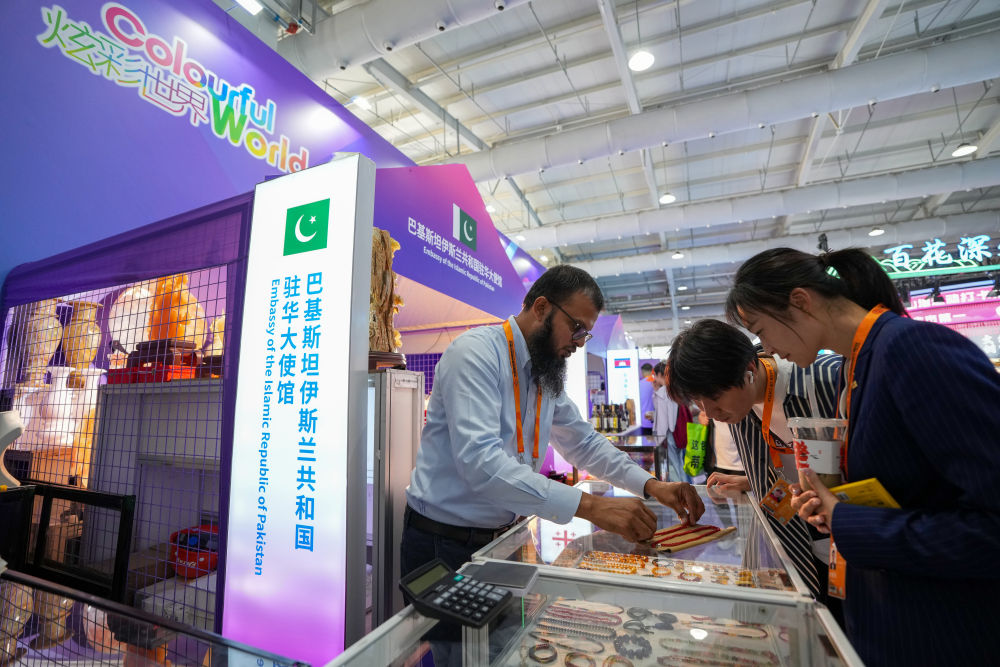 9月12日,在服貿(mào)會(huì)首鋼園區(qū)的炫彩世界——‘一帶一路’沿線國(guó)家特色文化展示活動(dòng)上,參觀者在巴基斯坦伊斯蘭共和國(guó)駐華大使館展區(qū)選購商品。新華社記者 鞠煥宗 攝