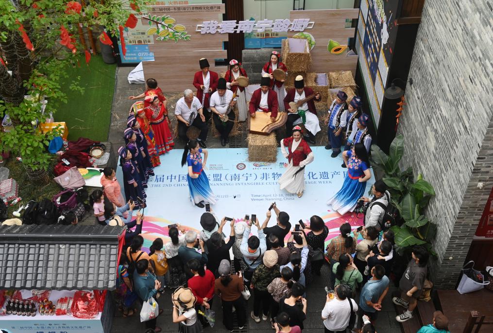 今年“三月三”期間,在南寧市三街兩巷的慶祝活動(dòng)現(xiàn)場(chǎng),多彩非遺文化展演吸引游客駐足欣賞。新華社記者陸波岸 攝