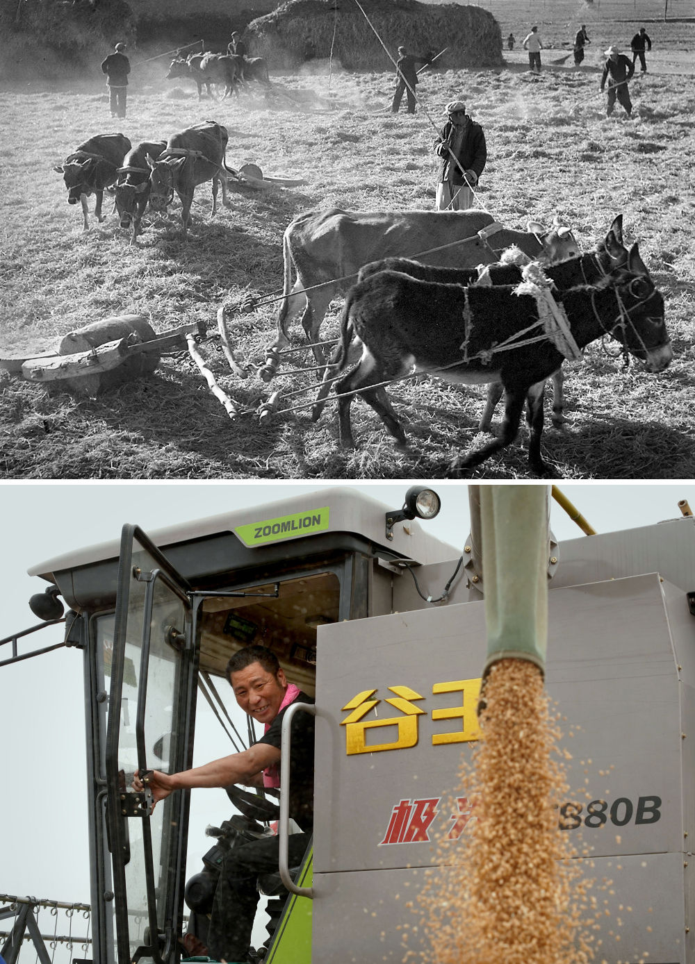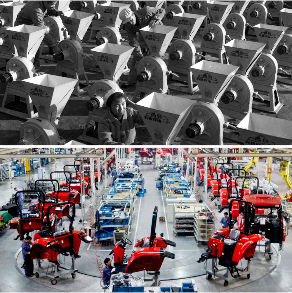 拼版照片:上圖為1971年,河南禹縣(現禹州市)生產的大批粉碎機準備運送出廠(蔡玉琦 攝);下圖為2012年9月12日拍攝的河南洛陽一拖集團東方紅拖拉機生產線(新華社發(fā))。
