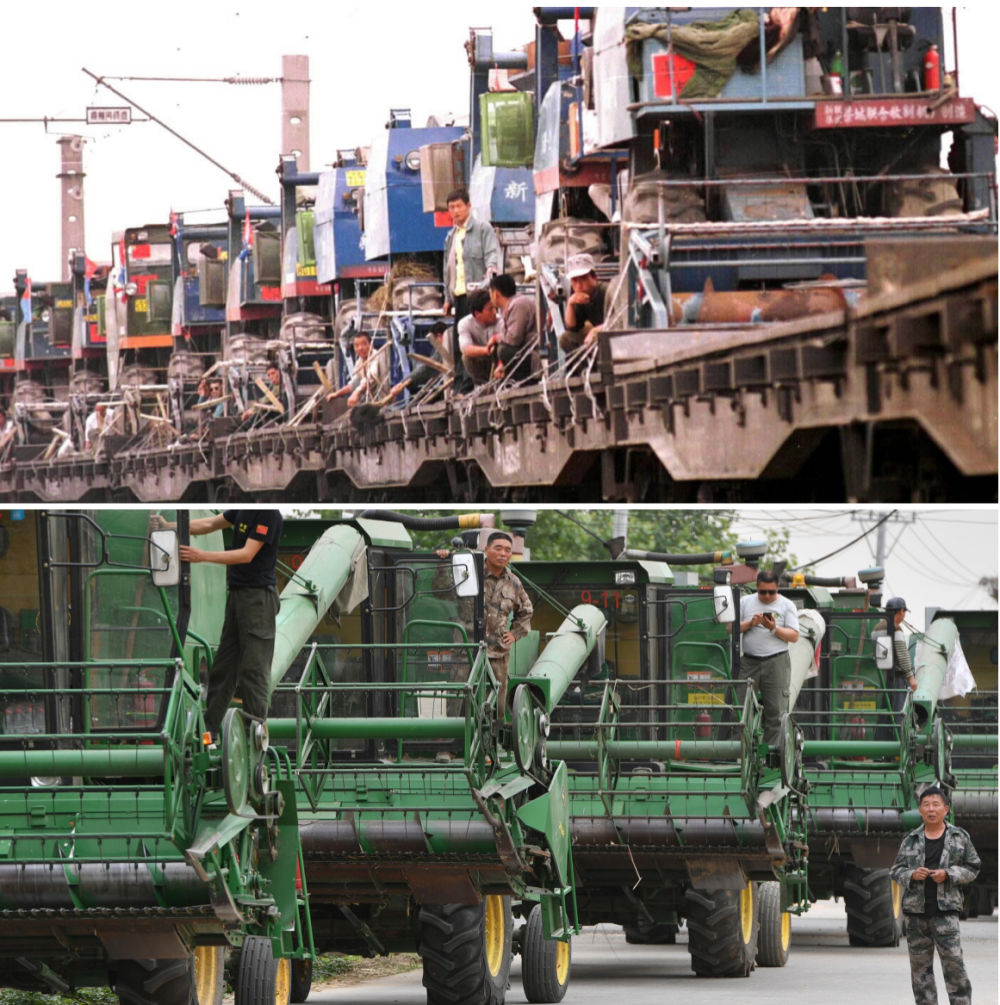 拼版照片:上圖為1999年,滿載著參加跨區(qū)收割小麥作業(yè)收割機的專列從石家莊鐵路分局正定火車站開出,將河北深州、藁城等地農民的120多臺收割機運往河南開封(新華社記者 周文廣 攝);下圖為2020年6月2日,在河南周口黃泛區(qū)農場九分場,農機隊伍準備出發(fā)(新華社記者 李嘉南 攝)。