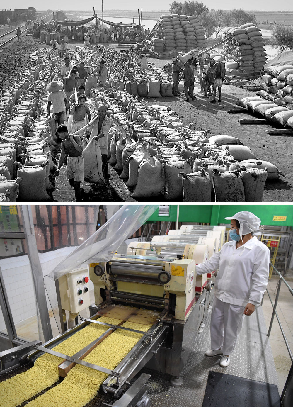 拼版照片:上圖為1963年,河南郾城裴城車站糧食收購站,堆放著大批農民交售的原糧(新華社記者 楊丙文 攝);下圖為2018年11月27日,在河南臨潁一家方便面生產企業(yè),工作人員在車間流水線上作業(yè)(新華社記者 李安 攝)。