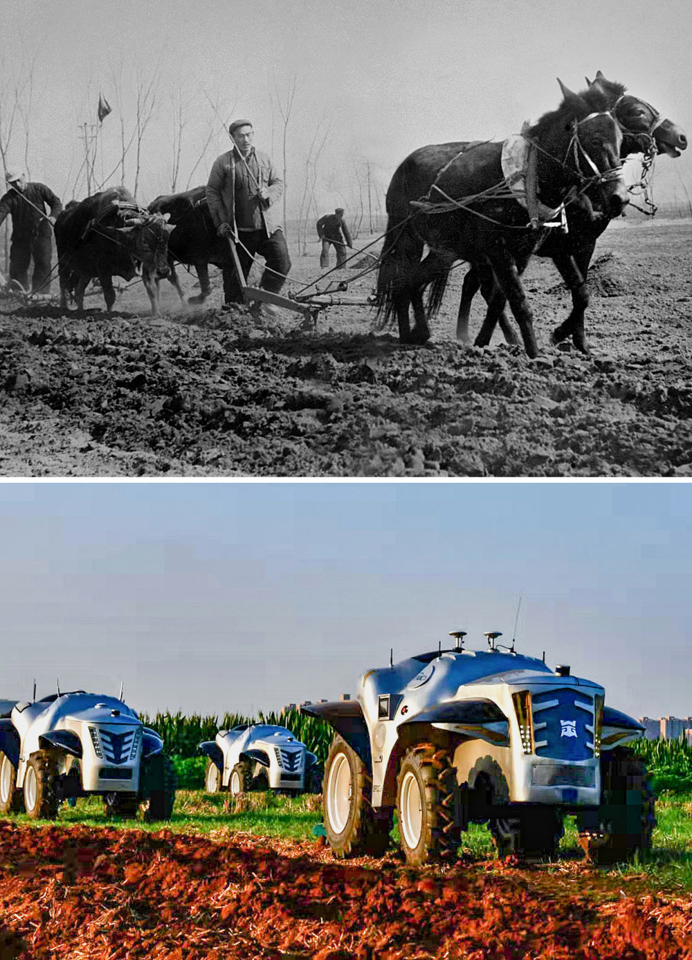 拼版照片:上圖為1954年,河南開封農民在用傳統(tǒng)的畜拉步犁耕地(呂學召 攝);下圖為2019年7月26日,洛陽一拖集團生產的純電動無人駕駛拖拉機準備做耕地測試(潘郁 攝)。