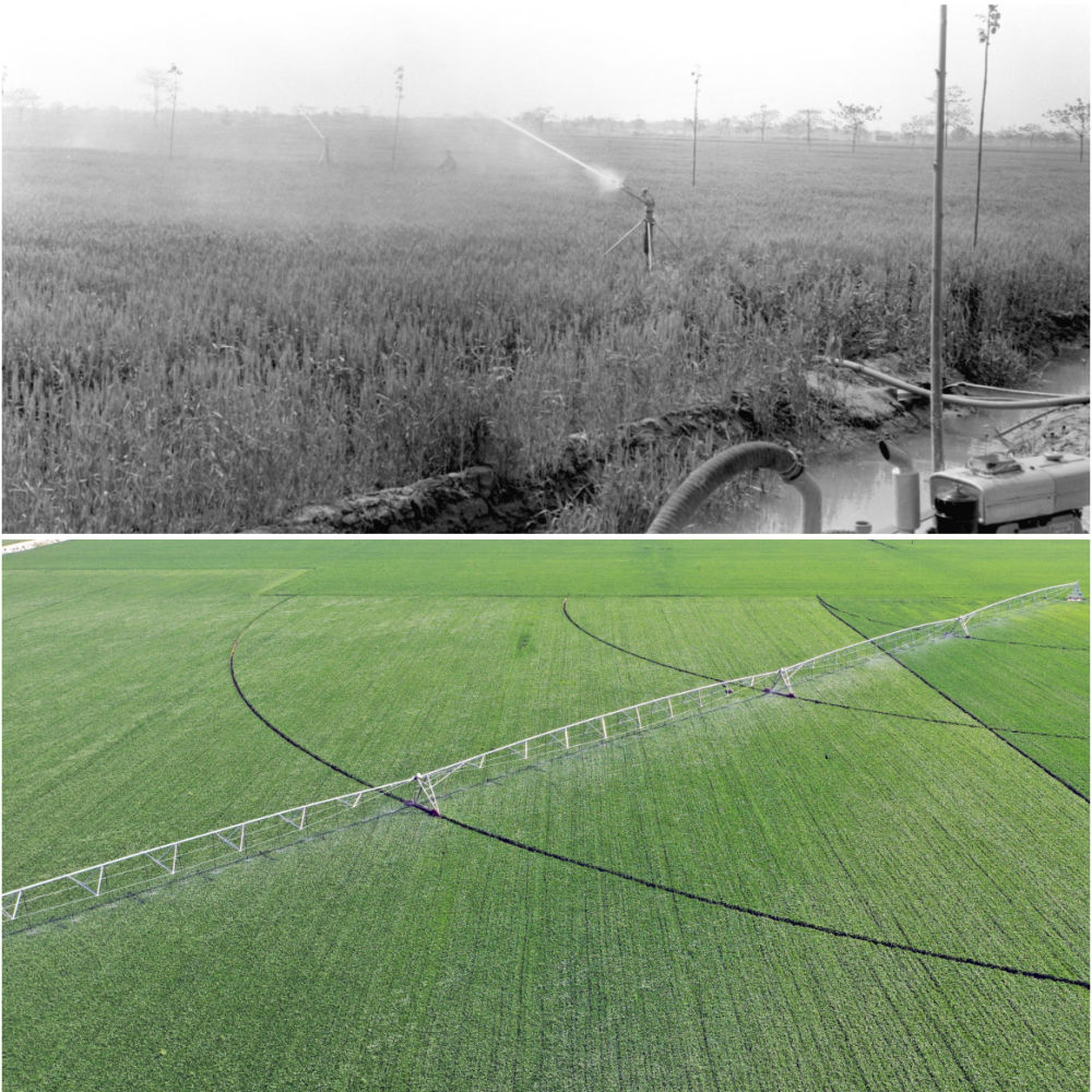 拼版照片:上圖為1981年,河南蘭考爪營公社爪營三大隊購買了12部噴灌機,在抗災中發(fā)揮了巨大作用,小麥獲得豐收(新華社記者 朱廣智 攝);下圖為2020年4月24日,在河南省??h30萬畝高標準糧田示范區(qū)內,大型噴灌機在進行噴灌作業(yè)攝(新華社記者 李嘉南 攝)。
