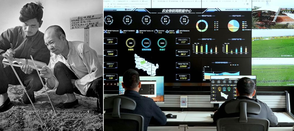 拼版照片:左圖為20世紀50年代,河南滎陽廣武農業(yè)社社員在測量、記錄地溫(謝延華 攝);右圖為2021年4月14日,工作人員在河南商水農業(yè)物聯(lián)網控制中心內工作(新華社記者 李安 攝)。