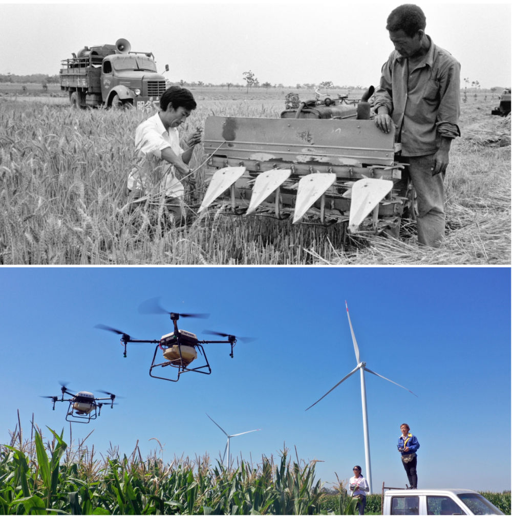 拼版照片:上圖為1986年,河南??h農機公司組織服務隊走村串鄉(xiāng)義務修理農業(yè)機械(新華社記者 唐茂林 攝);下圖為2020年9月4日,河南湯陰“精忠飛防大隊”飛手在操作植保無人機(新華社記者 李嘉南 攝)。