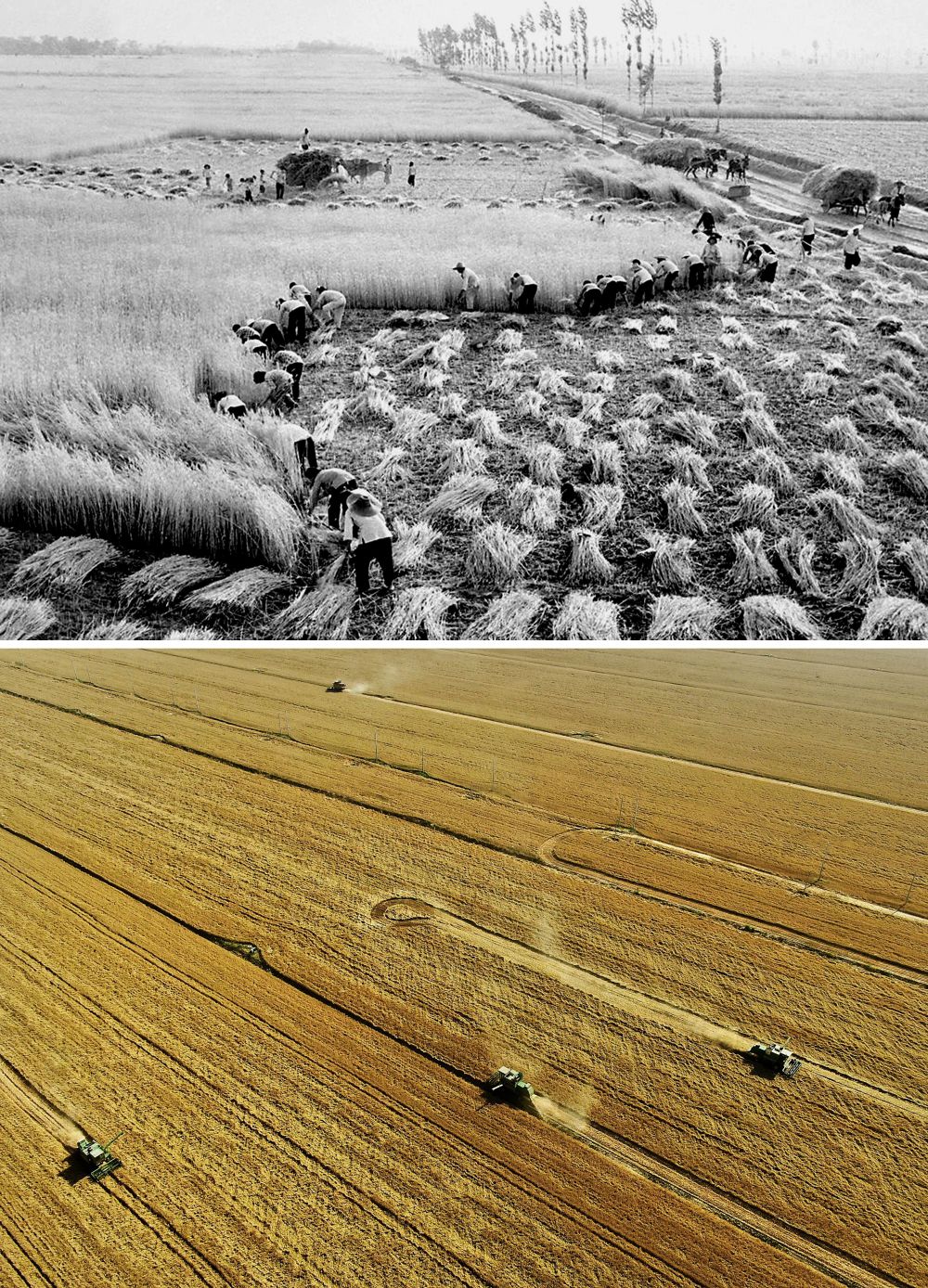 拼版照片:上圖為20世紀50年代,河南偃師萬畝豐產區(qū)開鐮收割小麥(新華社記者 唐茂林 攝);下圖為2021年6月6日,在河南周口黃泛區(qū)農場九分場的麥田里,農機手操作收割機收獲小麥(新華社記者 李安 攝)。