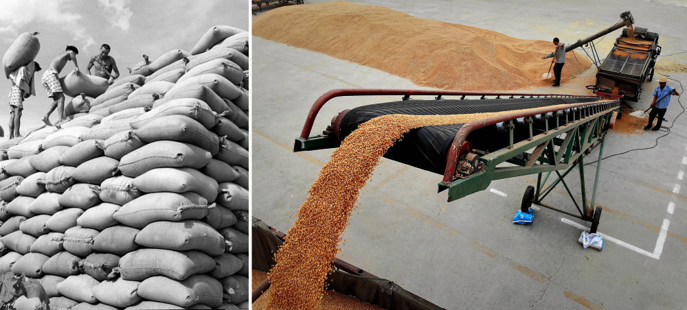 拼版照片:左圖為1959年,河南黃泛區(qū)農場員工在堆放剛收打的小麥,準備入倉(新華社記者 楊震河 攝);右圖為2018年6月4日,在河南黃泛區(qū)農場,工作人員將剛收打的小麥過篩后直接裝車,準備運往糧庫(新華社記者 李安 攝)。