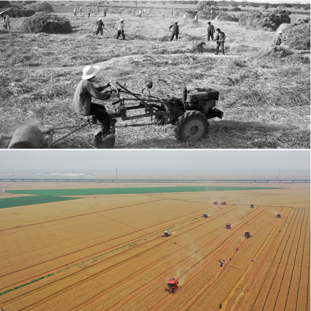 拼版照片:上圖為1982年,河南沈丘紙店公社紙店大隊13生產隊的社員用集體的手扶拖拉機碾打小麥(新華社記者 朱廣智 攝);下圖為2024年6月5日,河南省安陽市滑縣舉行小麥機收減損技能大比武活動,旨在規(guī)范節(jié)糧減損操作技能,減少糧食在收割環(huán)節(jié)的損失(新華社記者 郝源 攝)。