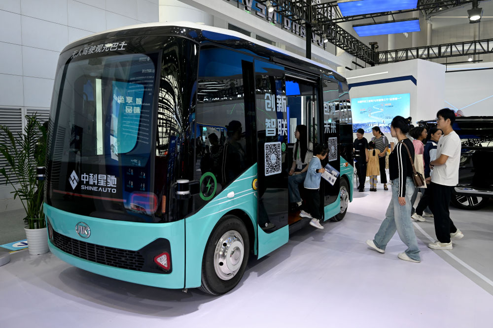 9月21日,在2024世界制造業(yè)大會(huì)上,人們參觀體驗(yàn)一款無(wú)人駕駛觀光巴士。新華社記者 黃博涵 攝