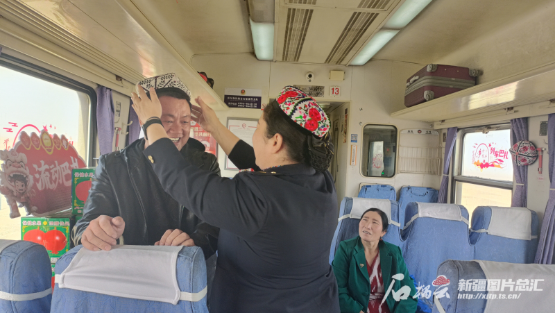 9月23日,7558次列車巴扎上,列車員瑪依然·賽買提給來(lái)新疆旅游的乘客戴上了一頂小花帽。石榴云/新疆日?qǐng)?bào)記者 宋衛(wèi)國(guó)攝
