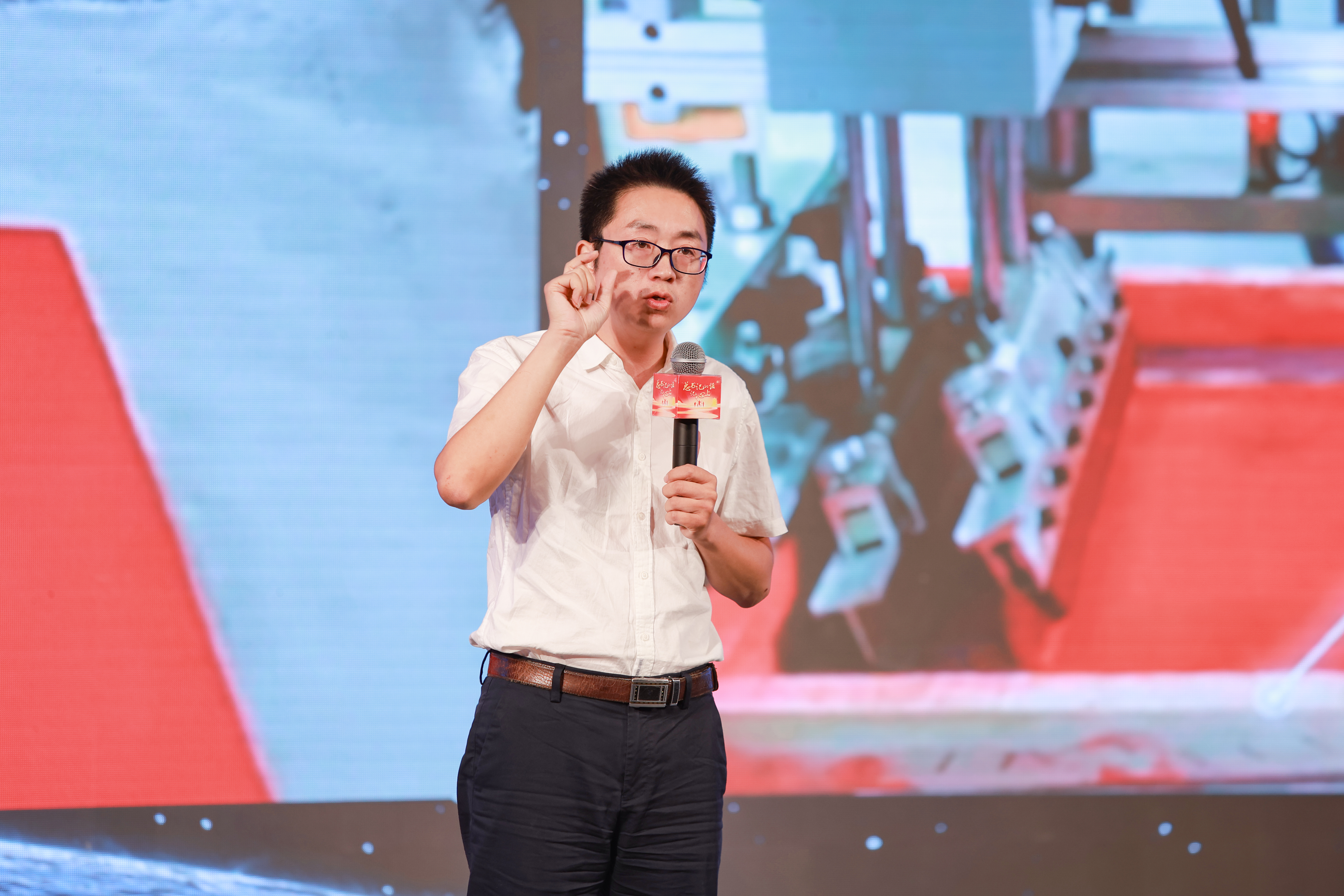習近平總書記說:“中華民族是勇于追夢的民族,黨中央實施探月工程,圓的就是中華民族自強不息的飛天攬月之夢?!蔽錆h紡織大學月面國旗研制團隊成員曹根陽教授帶著“石頭”版國旗和制作國旗的材料來到現(xiàn)場,引發(fā)了學生們陣陣驚呼?!拔覀兂晒α?!我們成功了!”回憶起五星紅旗成功展開、閃耀月球的那一刻,曹根陽教授哽咽了。一面小小的登月國旗,背后是團隊奮斗多年的科技創(chuàng)新之路。曹根陽教授生動講述月面國旗的研發(fā)歷程,給在座的學子們上了一場別開生面的科普課,更是一堂激蕩人心的愛國主義教育課。月面國旗研制團隊的新成員——武漢紡織大學的青年學子李環(huán)宇登臺接力,表示:“要做飛天攬月的一分子,讓心中閃耀的五星紅旗,飄揚在我們的上空,飄揚在每一個中國人足跡抵達的地方!伴隨信念飄揚在每一個人的心中,激勵我們?nèi)ネ吒h的地方!”