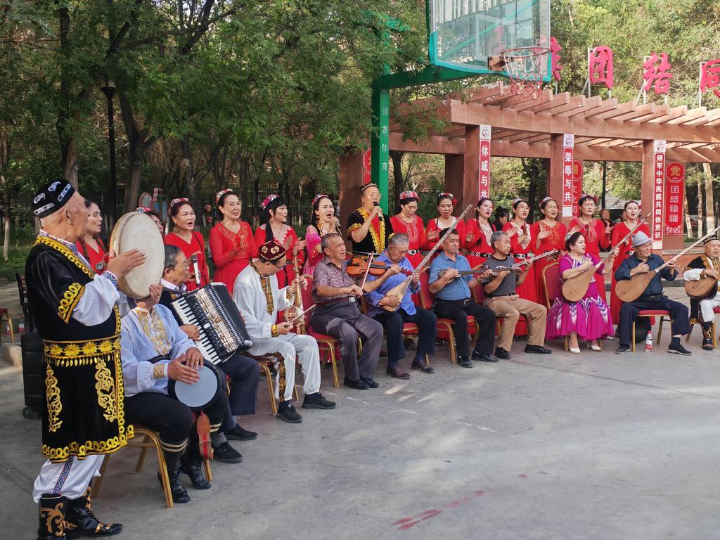 9月19日,庫爾勒市朝陽街道團(tuán)結(jié)社區(qū)“石榴籽藝術(shù)團(tuán)”團(tuán)長卡得爾·克衣木正帶著團(tuán)員們?yōu)榫用癖硌荨P氯A社記者顧煜 攝