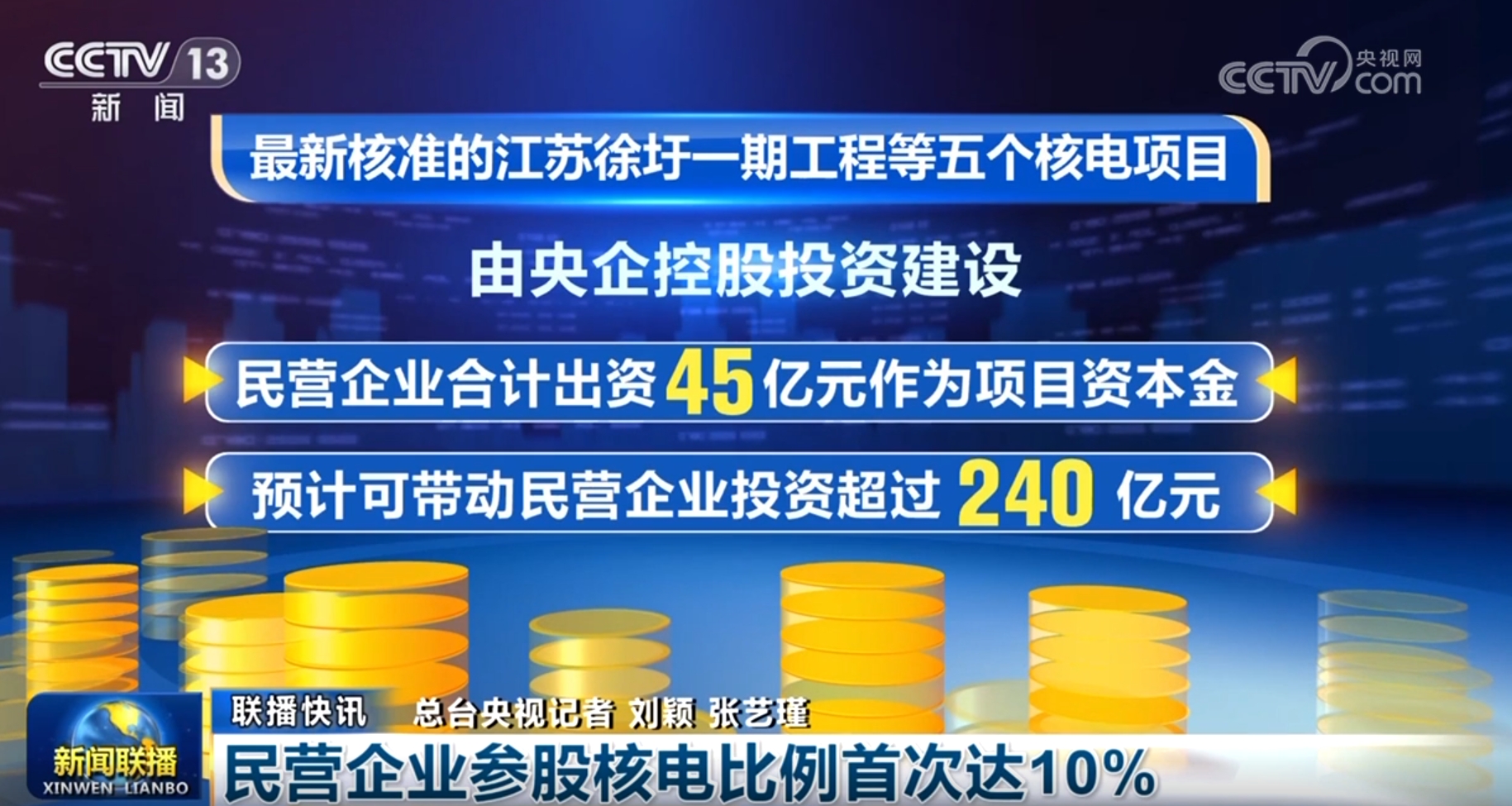 記者從國家發(fā)展改革委了解到,近期國務(wù)院核準的江蘇徐圩一期工程等五個核電項目,由央企控股投資建設(shè),民營企業(yè)合計出資45億元作為項目資本金,預(yù)計可帶動民營企業(yè)投資超過240億元。民營企業(yè)參股核電的比例首次提高到了10%,核電領(lǐng)域進一步向民資放開。