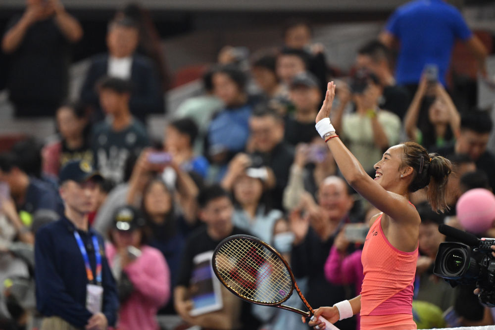 9月28日,鄭欽文在賽后向觀眾致意。當(dāng)日,在北京進(jìn)行的2024中國網(wǎng)球公開賽女單第二輪比賽中,中國選手鄭欽文2:0戰(zhàn)勝俄羅斯選手拉希莫娃,晉級(jí)下一輪。新華社記者 張龍 攝