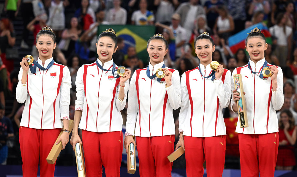 8月10日,中國隊(duì)在頒獎(jiǎng)儀式上。當(dāng)日,在巴黎奧運(yùn)會(huì)藝術(shù)體操項(xiàng)目集體全能決賽中,中國隊(duì)獲得冠軍。新華社記者 程敏 攝