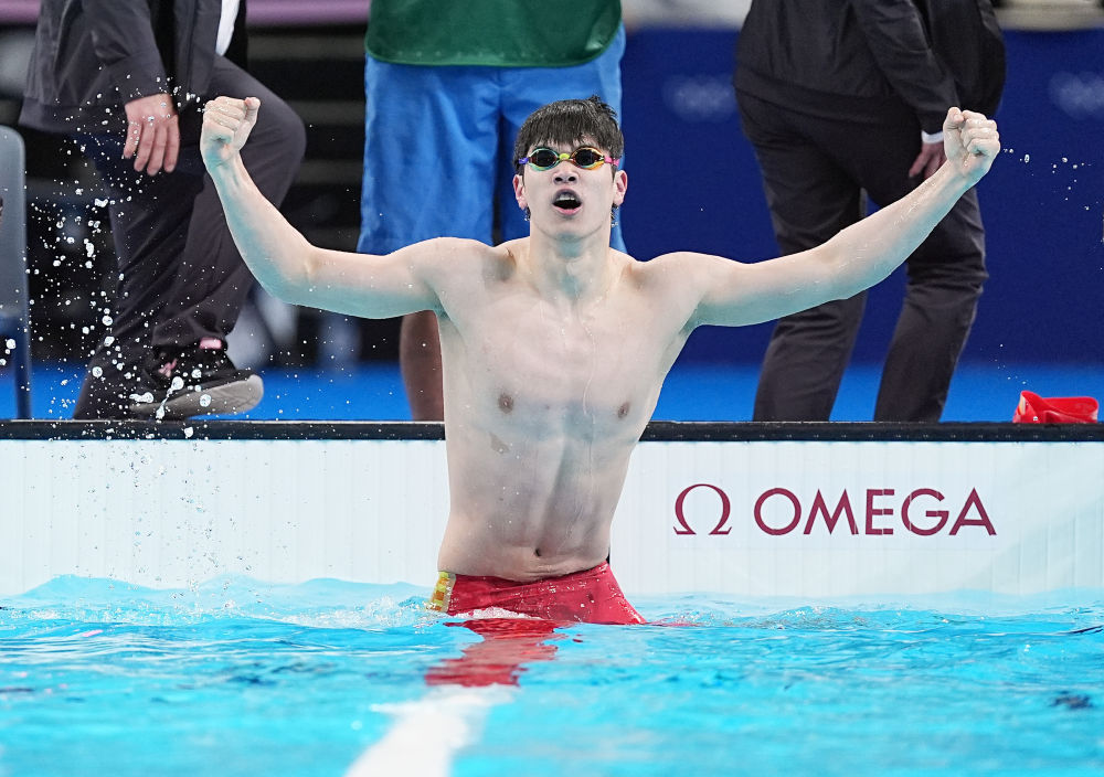 7月31日,在巴黎奧運(yùn)會(huì)游泳項(xiàng)目男子100米自由泳決賽中,中國選手潘展樂以46秒40的成績奪冠并打破世界紀(jì)錄。圖為潘展樂在賽后慶祝。新華社記者 杜宇 攝
