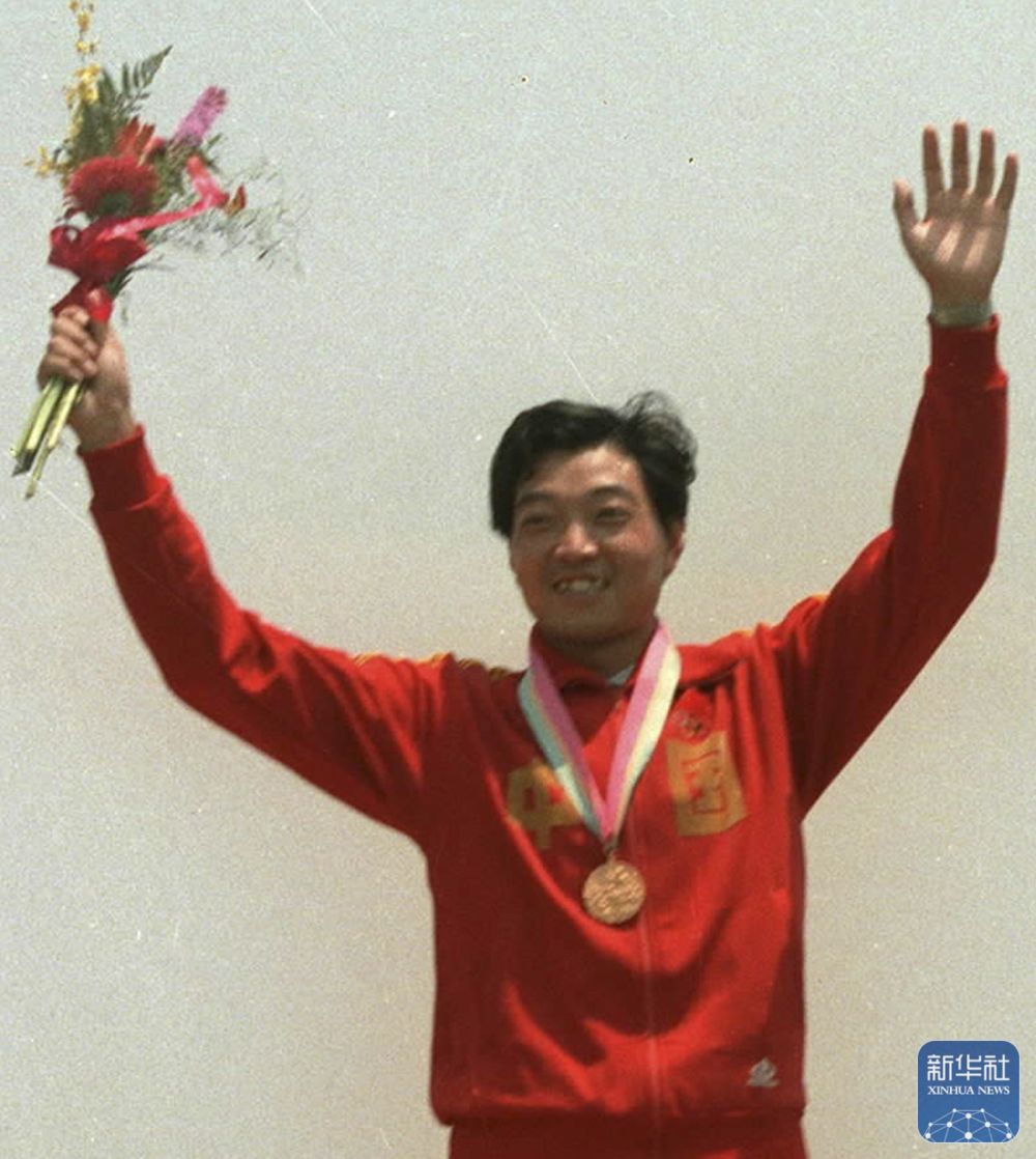 1984年洛杉磯奧運會上,許海峰在獲得男子自選手槍項目冠軍后領(lǐng)獎(資料照片)。 新華社發(fā)