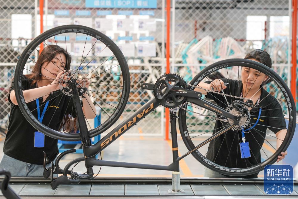 2024年7月8日,在山東泰山瑞豹復(fù)合材料有限公司生產(chǎn)車間,工人在組裝碳纖維自行車。位于山東樂陵經(jīng)濟(jì)開發(fā)區(qū)的泰山體育產(chǎn)業(yè)集團(tuán)為2024巴黎奧運會的摔跤、自行車、跆拳道、體操、田徑等比賽提供器材。新華社記者 朱崢攝