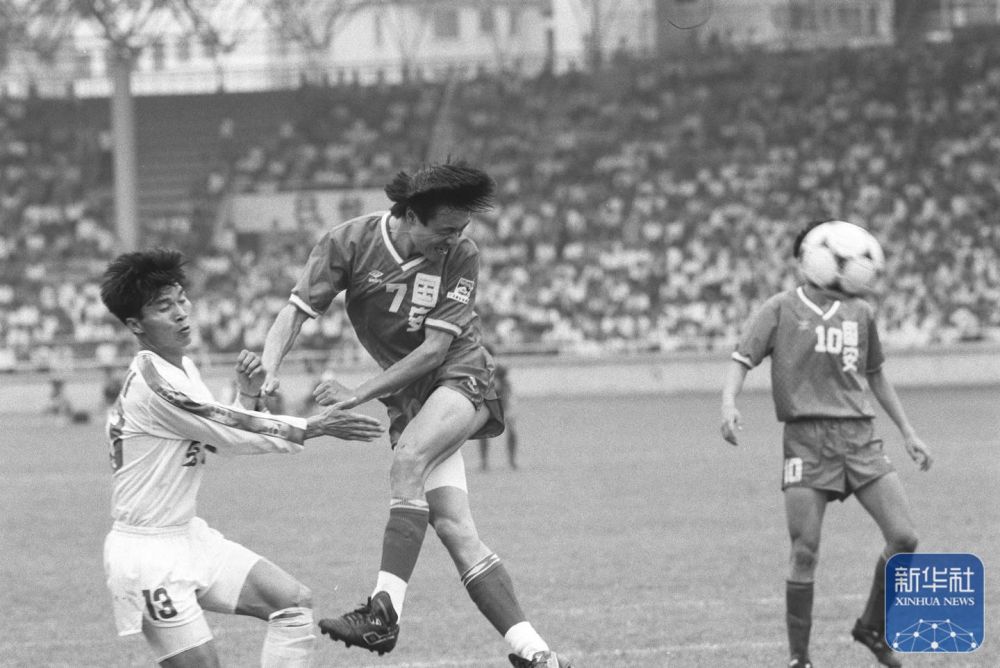1994是中國足球職業(yè)化改革元年。這是1994年4月17日,全國足球甲級聯(lián)賽全面拉開戰(zhàn)幕。廣東宏遠(yuǎn)俱樂部隊主場0比2負(fù)于北京國安俱樂部隊,這是國安隊7號謝峰(中)在頭球攻門。 新華社記者 劉彥武攝