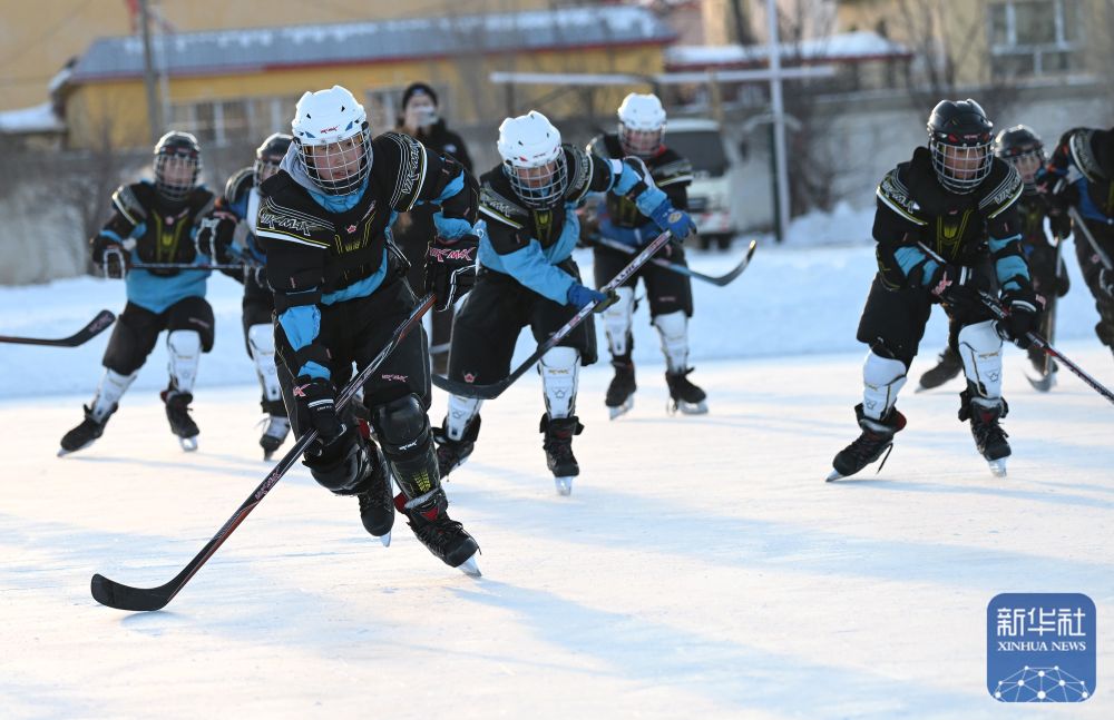 烏魯木齊縣水西溝中學(xué)冰球隊在訓(xùn)練(2023年12月20日攝)。 新華社記者 李賀 攝