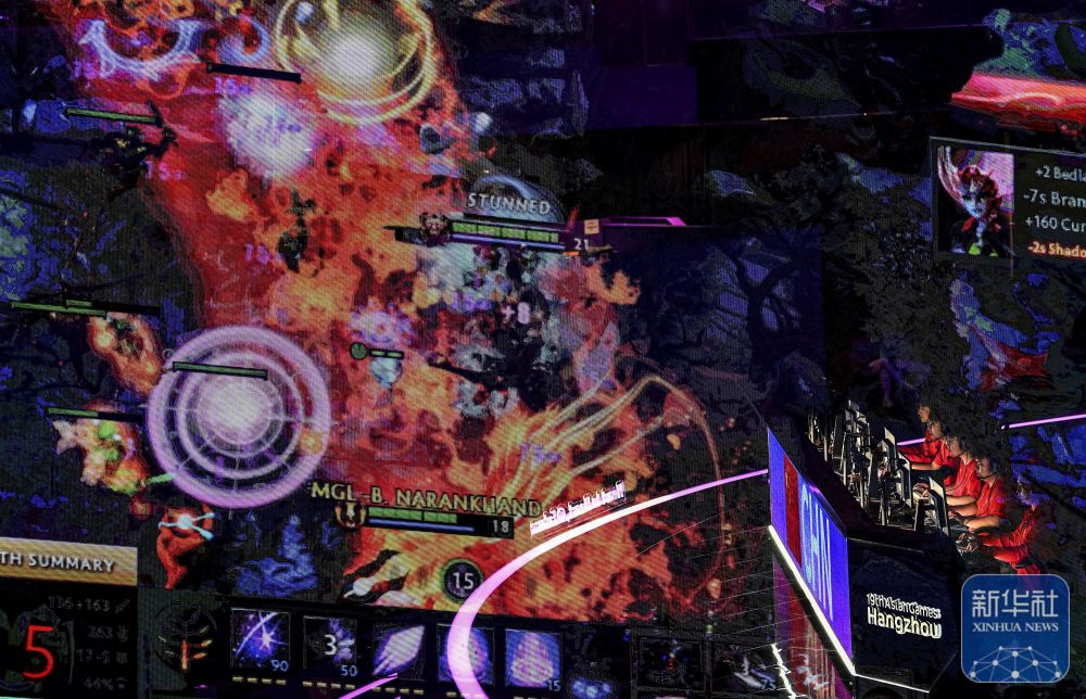 2023年10月2日,中國隊選手在比賽中(多重曝光照片)。 當(dāng)日,在杭州亞運會電子競技項目刀塔決賽中,中國隊以2比1戰(zhàn)勝蒙古國隊,獲得冠軍。 新華社記者 顏麟蘊 攝