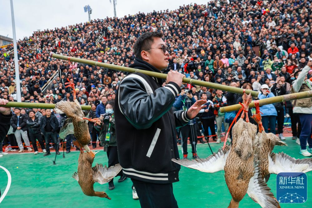 2023年3月27日,村民挑著當(dāng)?shù)剞r(nóng)特產(chǎn)品“三穗麻鴨”進(jìn)入賽場。這是季軍銅仁市代表隊的獎品。 當(dāng)日,貴州省首屆“美麗鄉(xiāng)村”籃球聯(lián)賽總決賽在黔東南州臺江縣臺盤村舉行。新華社記者 歐東衢 攝