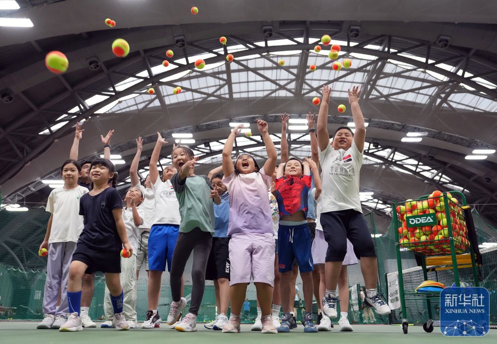 2024年8月14日,在北京一家網(wǎng)球俱樂部,小學(xué)員在結(jié)束網(wǎng)球暑期夏令營的課程后合影。 新華社記者 才揚 攝