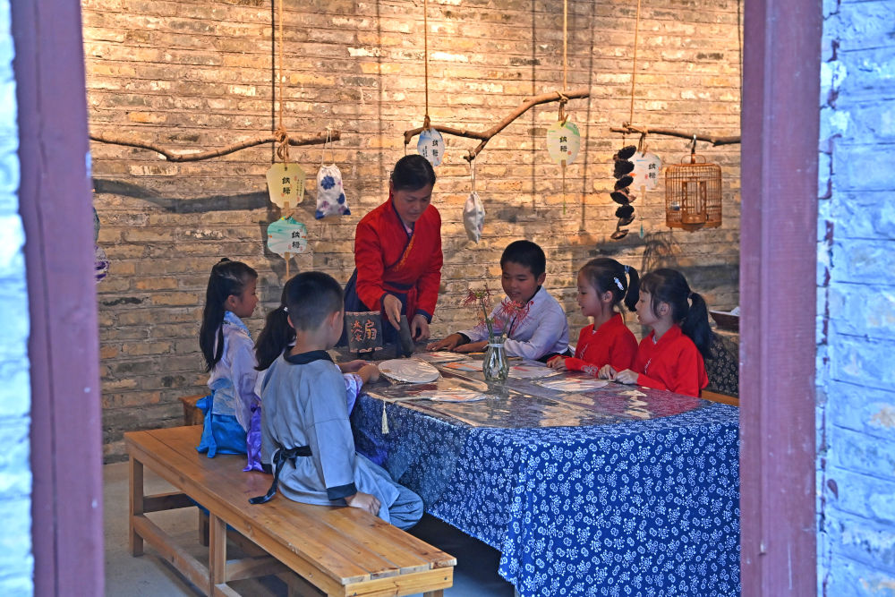 一名老師帶著幾名孩子在廣西來(lái)賓市象州羅秀鎮(zhèn)納祿村的古學(xué)堂里學(xué)習(xí)(10月10日攝)。