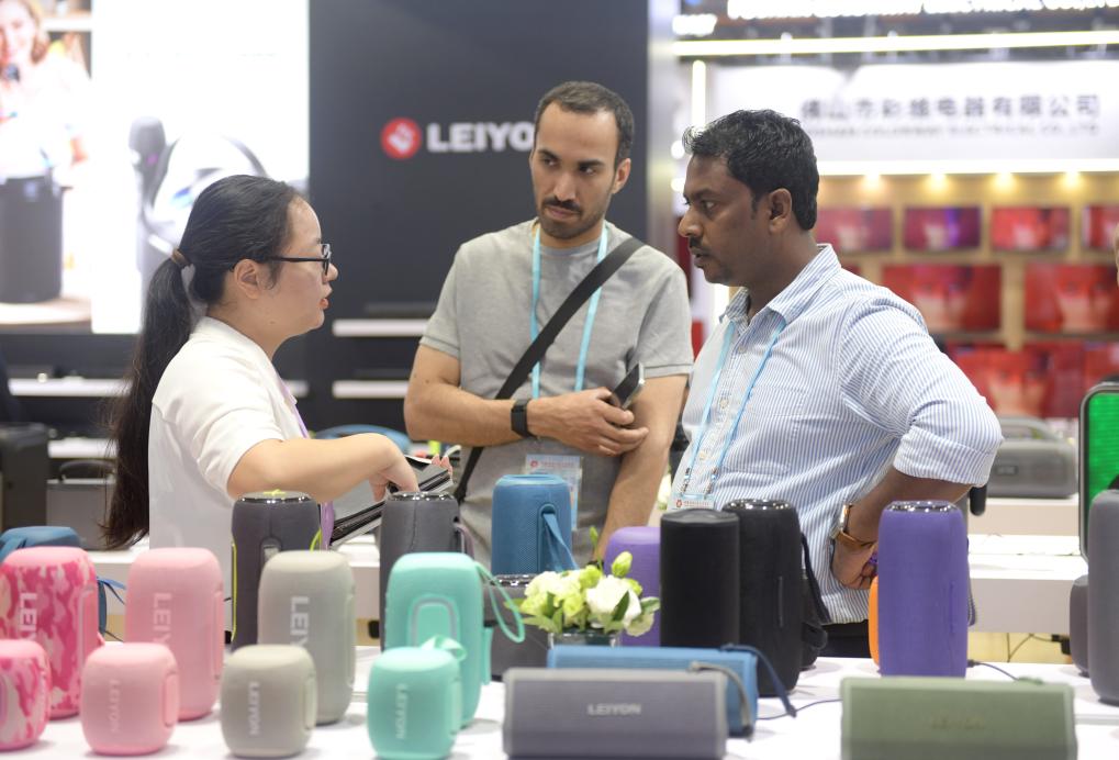 10月15日,客商在廣交會展館內參觀選購音箱。新華社記者盧漢欣 攝