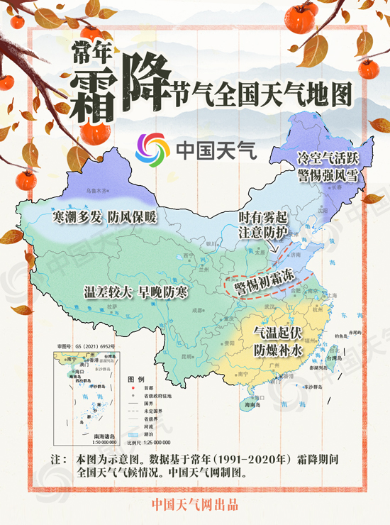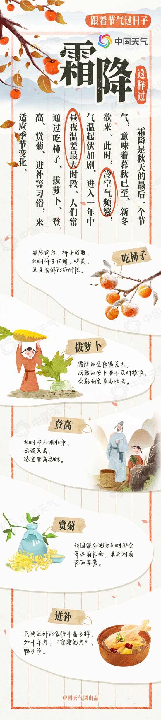 春生夏長,秋收冬藏,跟著節(jié)氣過日子。今天(10月23日)進入秋天的最后一個節(jié)氣——霜降,意味著暮秋已至、新冬欲來。此時,冷空氣頻繁,氣溫起伏加劇,進入一年中晝夜溫差最大時段。人們常通過吃柿子、拔蘿卜、登高、賞菊、進補等習俗,來適應季節(jié)變化。中國天氣網(wǎng)特別推出霜降風俗圖鑒和霜降全國天氣地圖,看看這個節(jié)氣怎么過。
