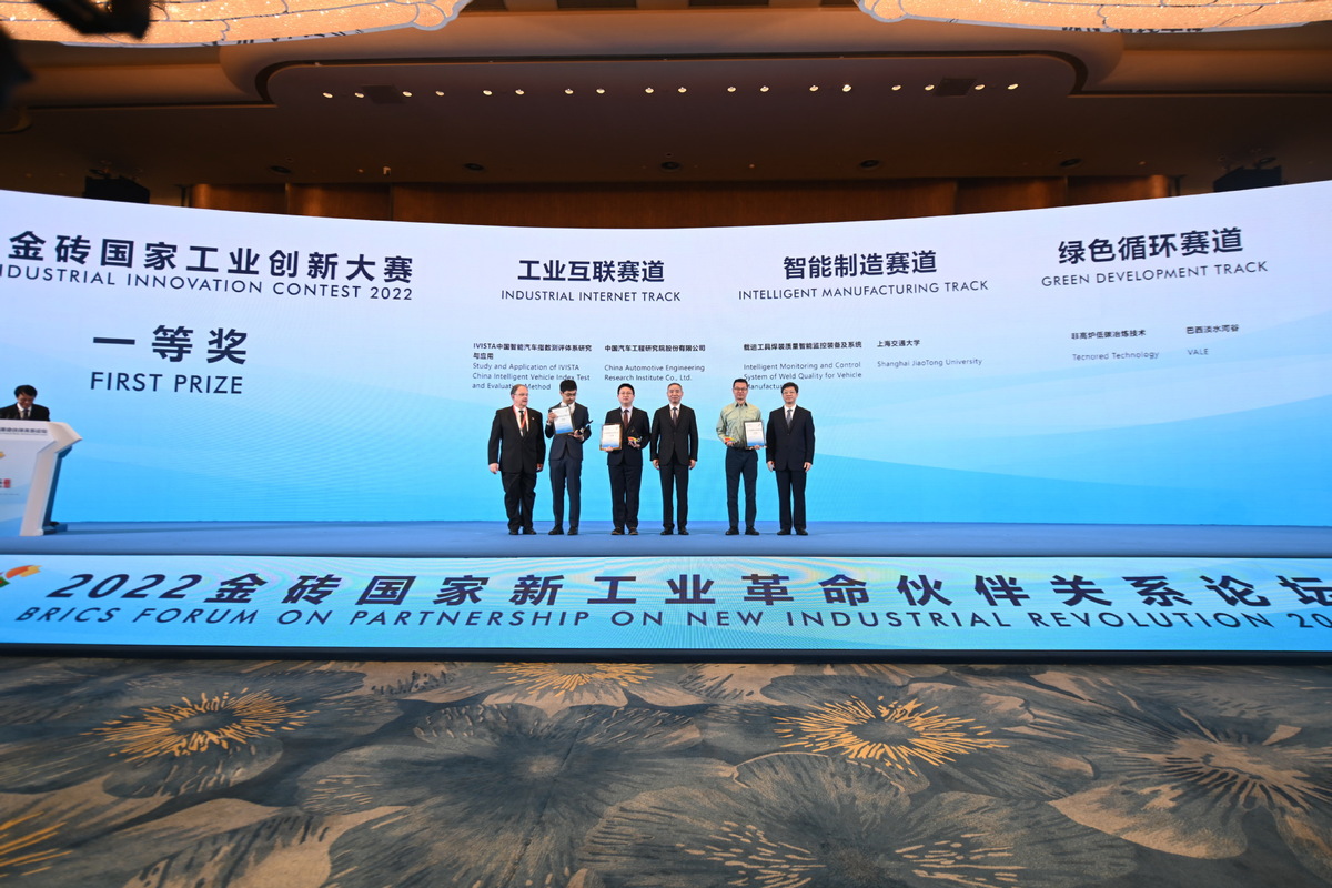 2022年9月7日,2022金磚國家工業(yè)創(chuàng)新大賽一等獎獲得者和頒獎嘉賓在廈門合影。(圖片來源:新華社)