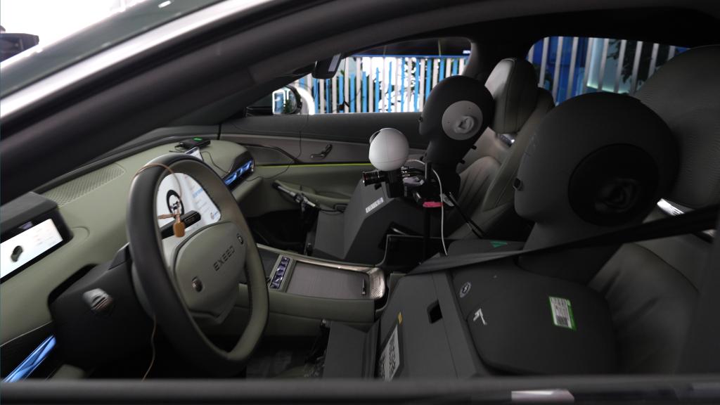 在展區(qū)中的一輛新能源汽車內(nèi)部,一臺(tái)機(jī)器人正在模擬乘客與汽車進(jìn)行語音交互,汽車外的一塊大屏幕上,實(shí)時(shí)分析顯示語音交互效果的準(zhǔn)確性、穩(wěn)定性和及時(shí)性,并最終自動(dòng)生成報(bào)告。這款智能座艙人機(jī)交互效果評(píng)測(cè)機(jī)器人首次亮相,便吸睛無數(shù)。