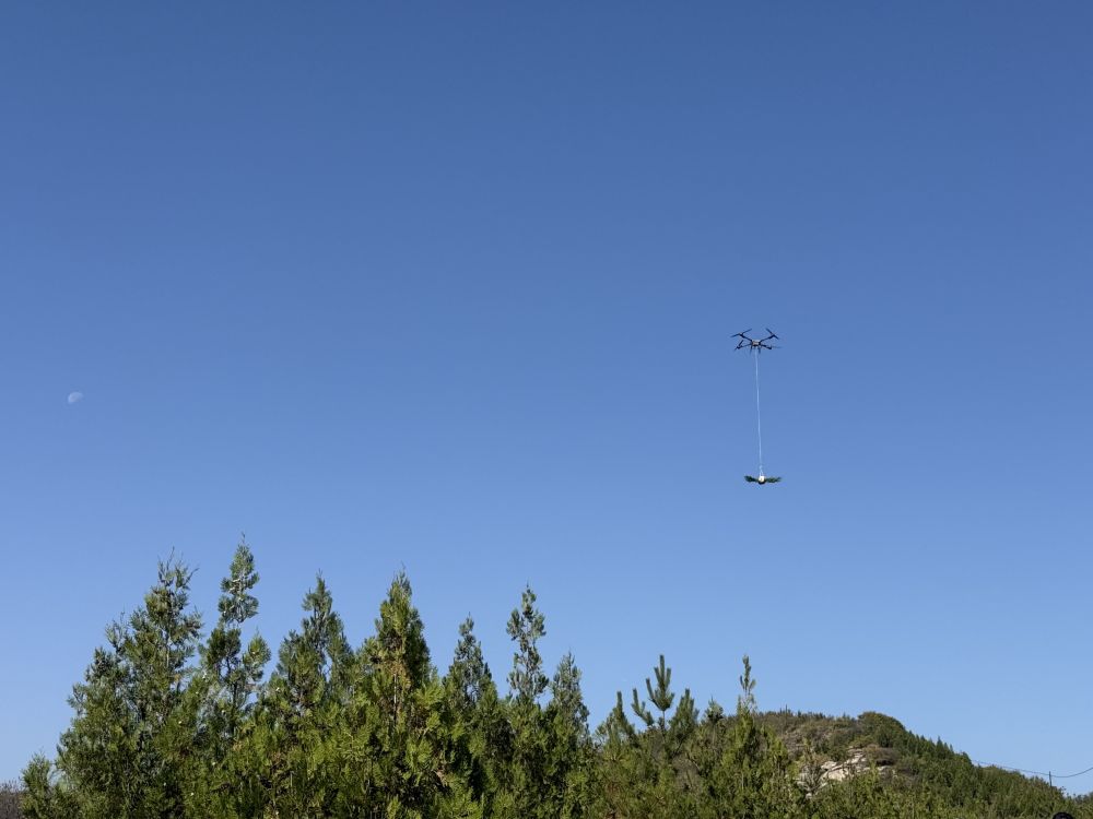 “懸崖造林隊”隊員在操作無人機,將樹苗運到另一側(cè)山頭。