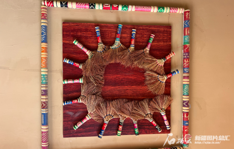 疏附縣托克扎克鎮(zhèn)阿亞格曼干村手工掃把工藝坊里,村民依巴古麗·阿布都克然用掃把做的旅游紀(jì)念品。石榴云/新疆日報(bào)記者 拍熱扎提·阿不都攝