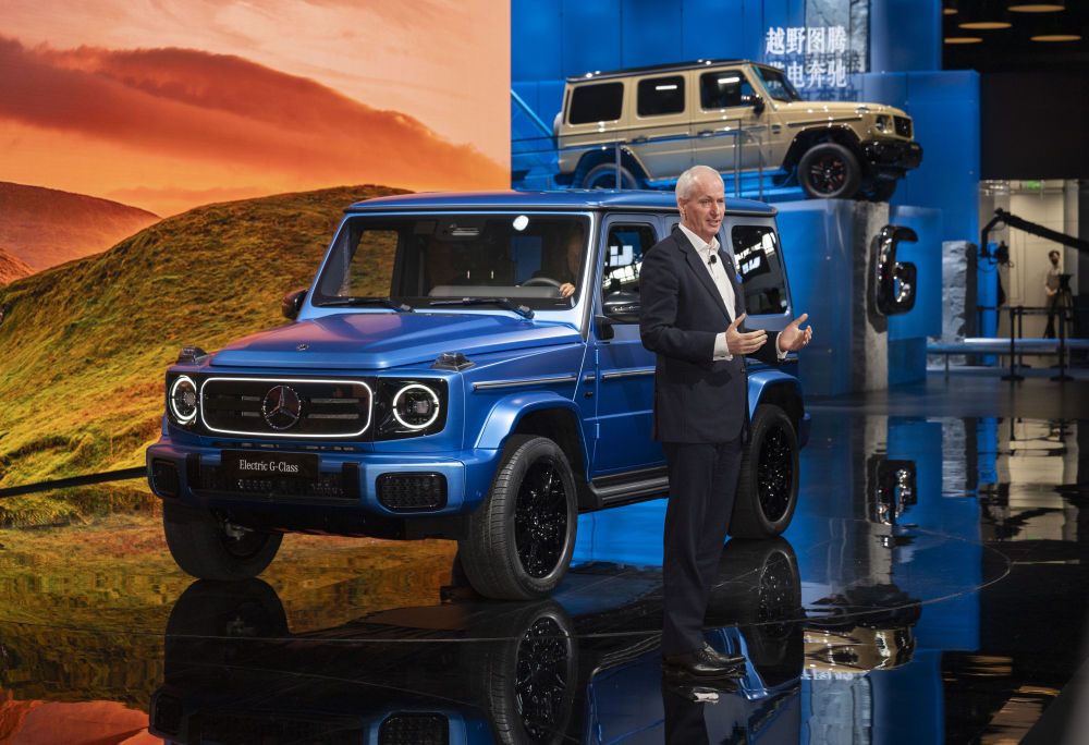 2024年4月25日,在北京中國(guó)國(guó)際展覽中心順義館舉行的2024北京車展上,梅賽德斯—奔馳集團(tuán)股份公司董事會(huì)成員唐仕凱介紹梅賽德斯—奔馳純電G級(jí)越野車。新華社記者才揚(yáng)攝