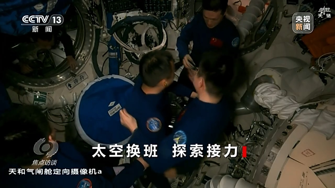 重返中國(guó)空間站的神十九航天員蔡旭哲打開(kāi)艙門(mén),再次體驗(yàn)失重,他輕松地就從飛船進(jìn)入空間站節(jié)點(diǎn)艙,和等待他們到來(lái)的神十八乘組來(lái)了一個(gè)大擁抱。第一次進(jìn)入空間站的兩位“90后”航天員也同樣受到了熱烈的歡迎。在打掃一新的空間站核心艙,歡迎儀式必不可少。