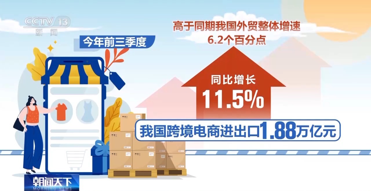 據(jù)海關(guān)總署最新發(fā)布的數(shù)據(jù)顯示,今年前三季度,我國(guó)跨境電商進(jìn)出口1.88萬億元,同比增長(zhǎng)11.5%,高于同期我國(guó)外貿(mào)整體增速6.2個(gè)百分點(diǎn),正成為我國(guó)外貿(mào)增長(zhǎng)新動(dòng)能。