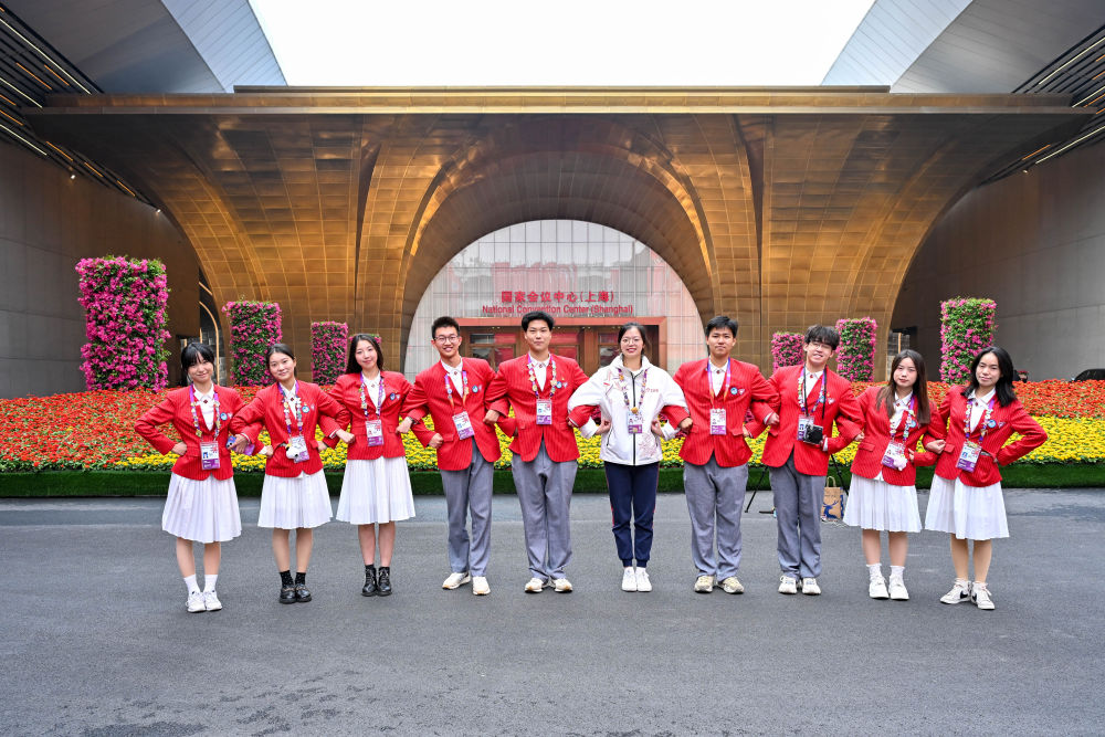 11月4日,志愿者在第七屆中國國際進口博覽會舉辦場地——國家會展中心(上海)合影。