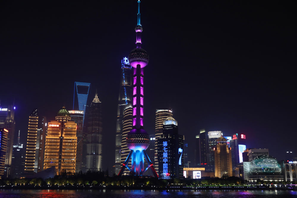 11月3日,位于上海陸家嘴的東方明珠廣播電視塔和大樓亮起主題燈光,迎接第七屆中國國際進口博覽會開幕。