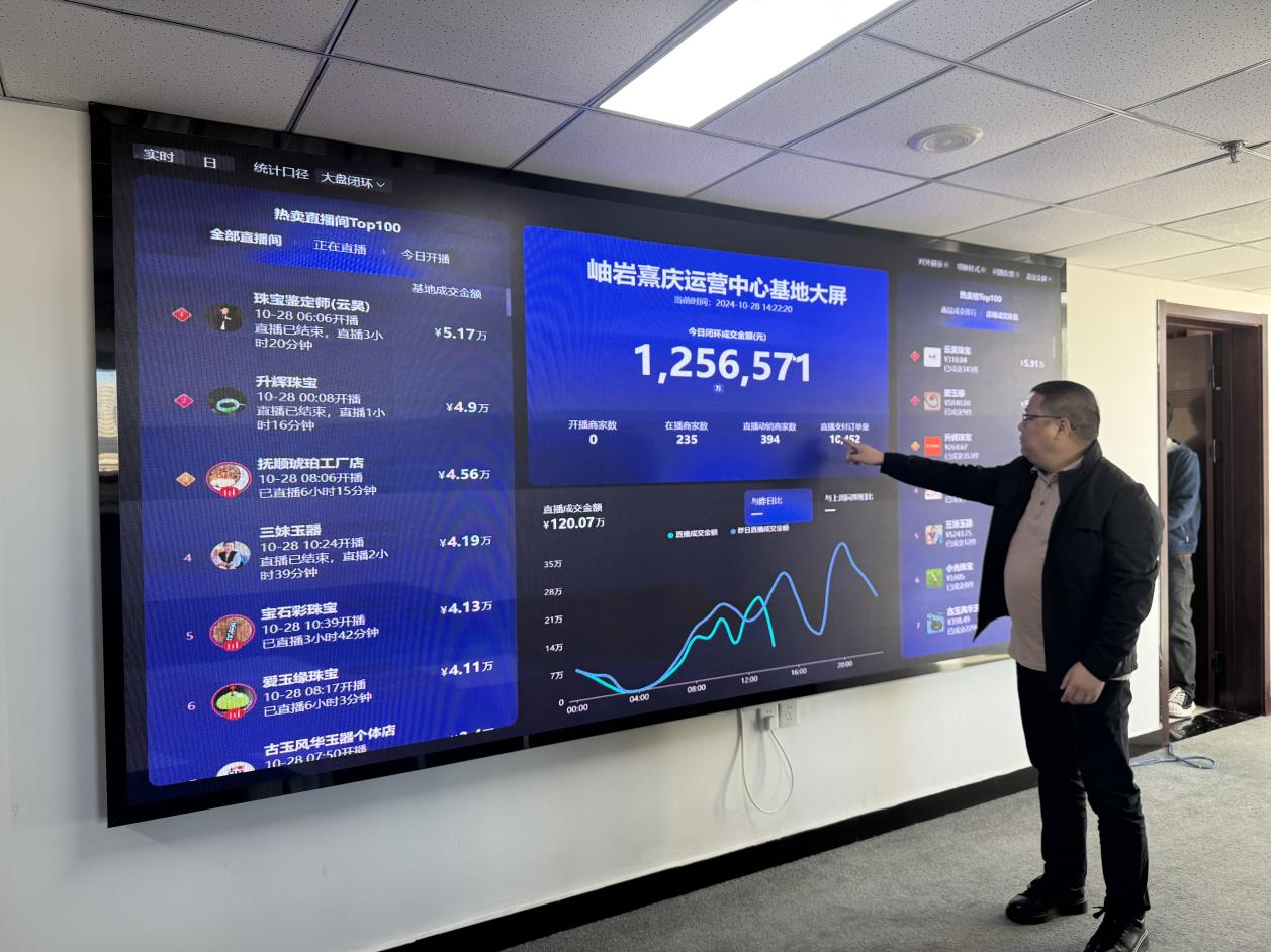 “1256571元,這是我們一上午的交易額”,岫巖熹慶運(yùn)營中心的負(fù)責(zé)人指著墻上的大屏幕說:“通過這塊屏幕,不僅能實(shí)時(shí)看到各家商戶的開播、交易情況,還可以通過數(shù)據(jù)的波動(dòng)及時(shí)發(fā)現(xiàn)存在的問題?!?/p>