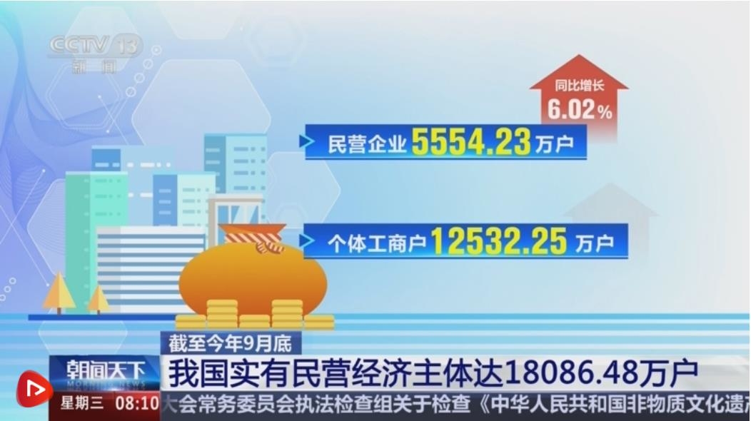 市場(chǎng)監(jiān)管總局11月6日公布我國(guó)經(jīng)營(yíng)主體發(fā)展數(shù)據(jù)顯示,截至2024年9月底,我國(guó)實(shí)有民營(yíng)經(jīng)濟(jì)主體總量達(dá)18086.48萬(wàn)戶。我國(guó)民營(yíng)經(jīng)濟(jì)主體數(shù)量持續(xù)穩(wěn)步提升。