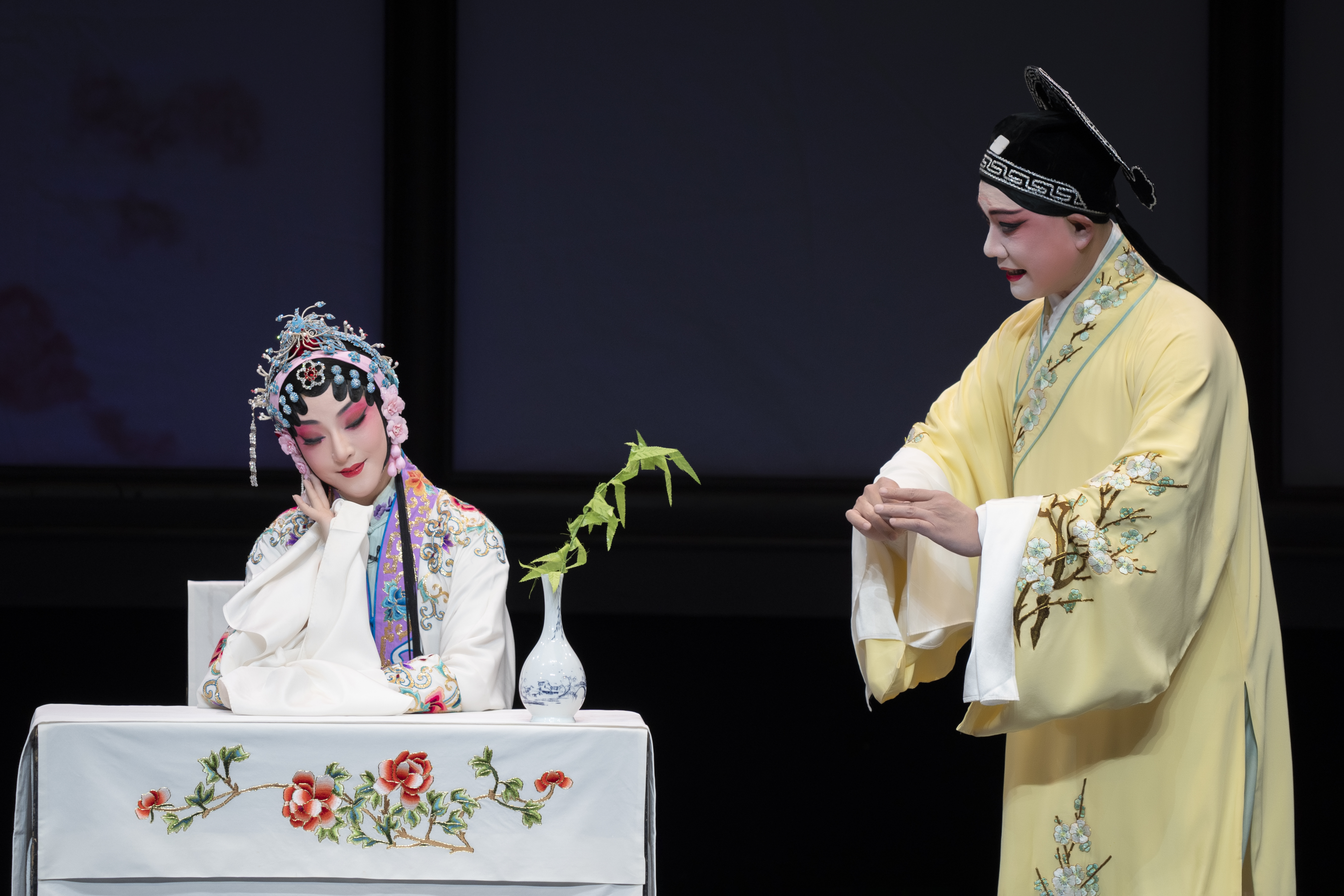 一桌一椅的極簡(jiǎn)舞臺(tái),為什么卻能在觀眾心中撐出一個(gè)內(nèi)涵極為豐富的文化空間?《牡丹亭》以其文辭典雅、語(yǔ)言秀麗著稱,被譽(yù)為“花中之后”,不僅是中國(guó)古典戲曲中的瑰寶,更是中國(guó)戲劇文學(xué)發(fā)展史上的重要里程碑。“我15年前第一次聽(tīng)昆曲時(shí),覺(jué)得節(jié)奏很慢,難以適應(yīng)。如今再次觀看《牡丹亭》,盡管生活節(jié)奏加快了許多,我卻能更加從容地融入其中,深刻體驗(yàn)到中華傳統(tǒng)文化之美?!庇^眾于女士感嘆,不止于戲文,《牡丹亭》的聲腔、表演、舞臺(tái),每一個(gè)元素都承載著深厚的文化價(jià)值,讓人在中國(guó)式審美中共鳴于人物的精神追求。
