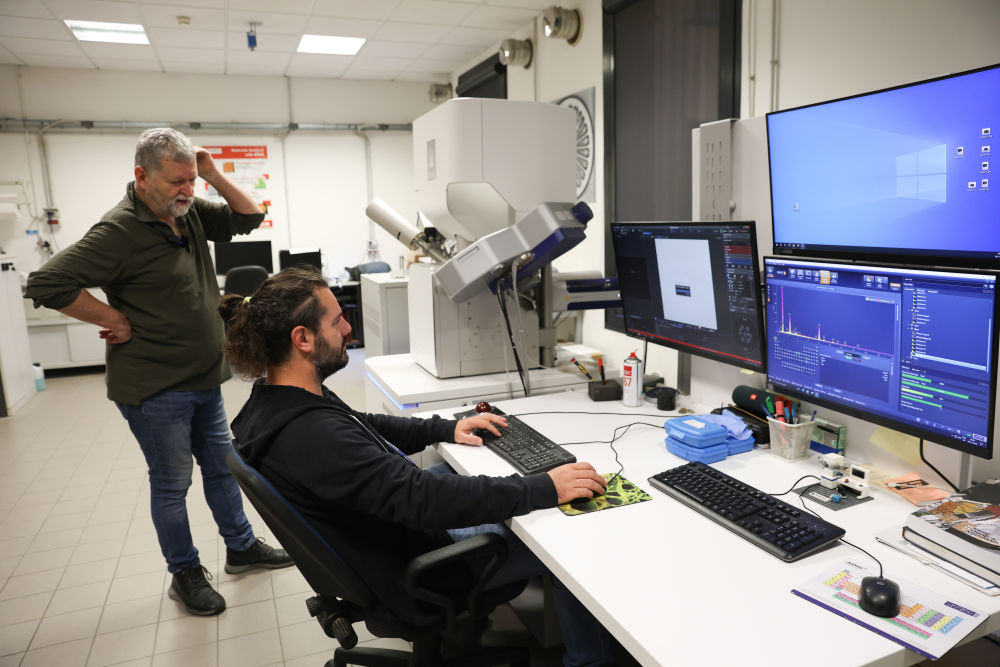11月6日,意大利帕多瓦大學(xué)文化遺產(chǎn)學(xué)院教授馬西莫·維達(dá)萊(左)與研究人員在實驗室討論青銅獅樣本檢測分析過程。新華社記者李京攝