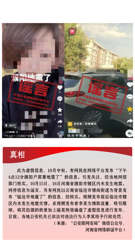 危言聳聽炒作話題。個(gè)別網(wǎng)民和自媒體編造虛假信息,炒作社會(huì)熱點(diǎn)話題,并配以具有煽動(dòng)性、誤導(dǎo)性的標(biāo)題,擴(kuò)散傳播,擾亂社會(huì)秩序。10月中旬,新疆喀什、阿克蘇地區(qū)相繼發(fā)生地震,部分自媒體罔顧事實(shí),利用AI技術(shù)拼湊網(wǎng)絡(luò)舊圖,編造完全與事實(shí)不符的地震廢墟或?yàn)?zāi)后救援圖片,混淆視聽,嚴(yán)重誤導(dǎo)網(wǎng)民。另有個(gè)別網(wǎng)民將拍攝的街景加上搖晃特效,惡意杜撰云南發(fā)生地震,引發(fā)公眾恐慌,造成不良影響。還有網(wǎng)民為給網(wǎng)店?duì)I銷引流,利用家長們高度關(guān)注兒童安全話題的心理,無中生有編造“四川巴中頻繁有青少年失蹤”謠言,引發(fā)公眾焦慮恐慌。