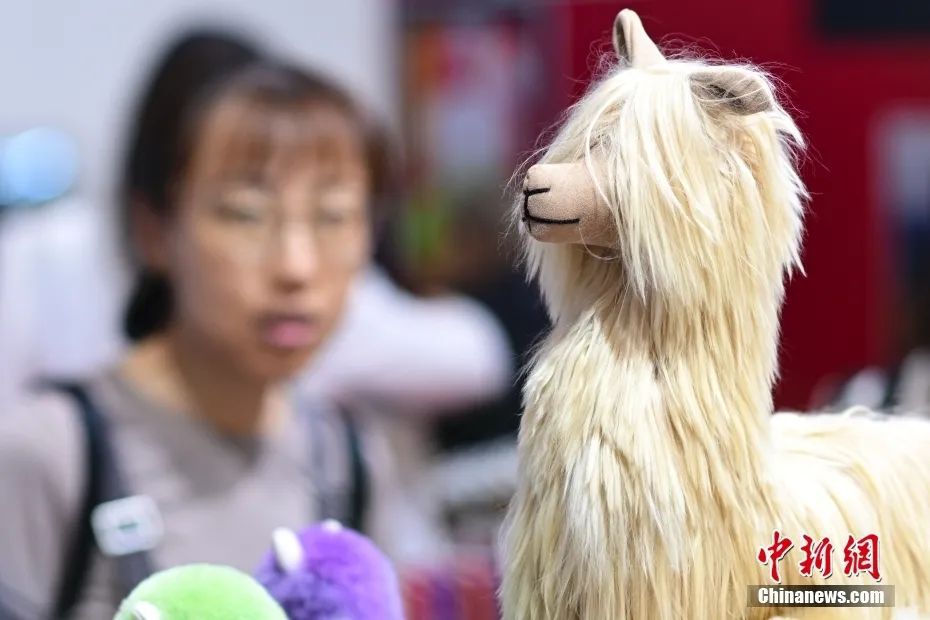 2023年9月4日,服貿(mào)會(huì)國家會(huì)議中心展區(qū),秘魯展臺(tái)羊駝毛制品吸引參觀者。中新社記者 田雨昊 攝