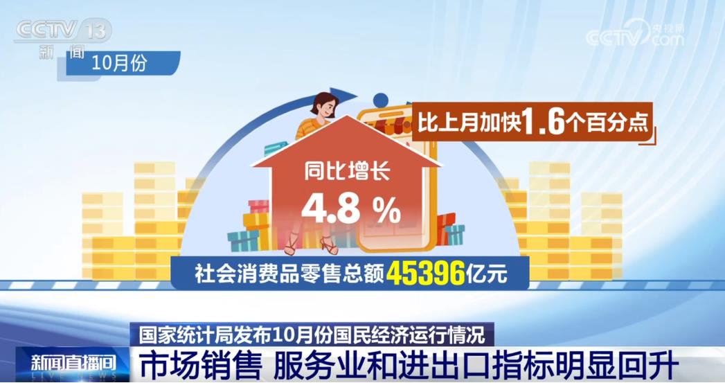 先說“三個回升”,10月份,市場銷售、服務(wù)業(yè)和進(jìn)出口三個指標(biāo)明顯回升。從市場銷售看,受消費(fèi)品以舊換新政策帶動,10月份社會消費(fèi)品零售總額同比增長4.8%,增速比上月加快1.6個百分點(diǎn),其中服務(wù)零售增勢依然較好。