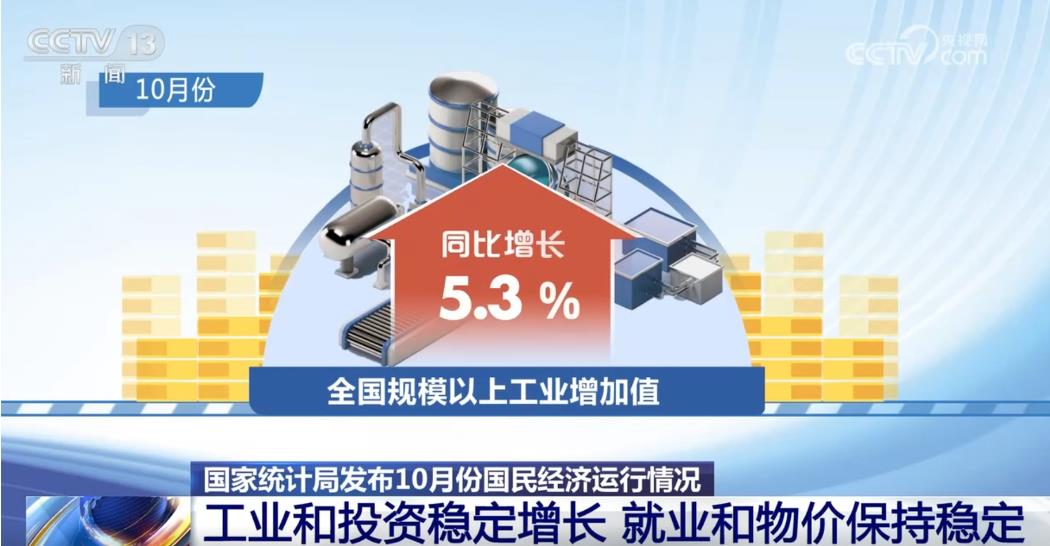 再說“兩個穩(wěn)定”,一是工業(yè)和投資穩(wěn)定增長,二是指就業(yè)和物價(jià)保持穩(wěn)定。從工業(yè)來看,在大規(guī)模的設(shè)備更新以及產(chǎn)業(yè)升級發(fā)展等因素驅(qū)動下,10月份規(guī)模以上工業(yè)增加值同比增長5.3%,繼續(xù)保持較快增長,其中制造業(yè)升級發(fā)展態(tài)勢明顯。