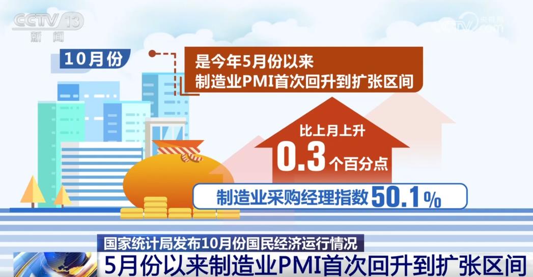 從經(jīng)營主體預(yù)期看,10月份制造業(yè)采購經(jīng)理指數(shù)為50.1%,比上月上升0.3個百分點(diǎn),是今年5月份以來制造業(yè)PMI首次回升到擴(kuò)張區(qū)間。從消費(fèi)者預(yù)期看,消費(fèi)者信心指數(shù)比上月回升1.2個百分點(diǎn),為連續(xù)六個月回落之后的首次回升。這些變化將極大激發(fā)市場活力,推動經(jīng)濟(jì)回升向好。